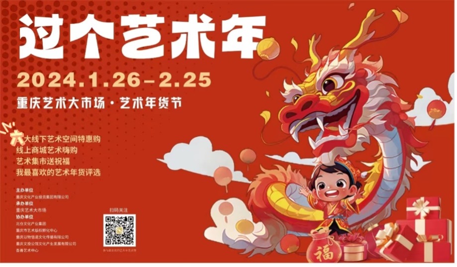 1月26日,“重慶藝術大市場·藝術年貨節”正式啟幕了!本次活動由重慶文投集團主辦,重慶嘉禾實業公司承辦,北倉文化產業集團、重慶市藝術版權孵化中心、重慶文投公館文化產業發展有限公司、重慶以物悟道文化傳播有限公司、吾善藝術中心聯辦。作為重慶藝術大市場的年末歲初大型文化活動,以“重慶文投助力重慶文旅:來一場別具特色的藝術年貨節”為主題,推出涵蓋繪畫、雕塑、裝置、非遺以及藝術衍生品等多種藝術形式,從巴渝文化到抗戰藝術,從架上作品到手工藝品,從渝中區中山四路85號,到江北區重慶大劇院、北倉,再到渝北區照母山紅星美凱龍,到黃桷坪涂鴉藝術街,最后到四川美術學院虎溪公社,將串聯起六個精彩紛呈的展覽單元,加之線上平行展銷,在春節前后為大家提供了一場品質極佳的文化盛宴。本次活動持續至2月25日,免費對市民、游客開放。暢玩六大線下藝術空間在除舊布新的春節來臨之際,人們都要舉行各種祭祝祈年的活動,許多以驅邪降福為主題的民間藝術也隨之發展,如年畫、春聯、剪紙、面塑等民間藝術,春節前后也通過這些民間藝術,表達了人們對未來一年的熱切期望。位于渝中區中山四路的85號創意公館率先開啟了一次關于重慶非物質文化遺產之旅。梁平木板年畫、榮昌陶、榮昌夏布、西蘭卡普、漆器……現場注重活態傳承展示,充滿體驗感,互動性強。市民、游客置身其中,可觀巴渝民俗之美、盡享非遺之美。大戲登臺!龐茂琨的《南川姑娘》、庹光焰的《迷葉》、趙青的《浮生17》、傅舟的《異蕊清香隸書》……悉數登場。本次“藝術年貨節”期間,重慶藝術大市場將開辟出四川美院虎溪公社藝術服務中心和紅星美凱龍至尊MALL“藝術家居中心”兩大空間作為特惠購賣場。其中四川美院藝術服務中心組織了百余件川美師生的原創藝術作品和美院周邊文創品,以展銷的形式開放。藝術服務中心位于校內虎溪公社,其展廳編號為虎溪公社底樓B101。因此,趁寒假期間,大家可以帶上小孩到藝術服務中心去,不但可以觀展,還能直購川美原創品。位于紅星美凱龍至尊mall的藝術家居中心,重慶藝術大市場也組織近百件適合家庭裝飾的藝術作品進行春節前特惠展銷。兩大線下空間展銷作品種類包括國畫、油畫、水粉、版畫、書法作品等。濃濃的過年氣氛要拉滿!1月27日下午重慶藝術大市場還將在北倉文創街區舉行“藝術集市送祝?!被顒?,邀請到知名書法家現場寫100副春聯,免費送給市民、游客。吾善藝術中心則將九龍坡區黃桷坪的“老藝術風”發揮到絢麗的極致:被戲稱為“黃桷坪蓋茨比”的劉佳嘗試用雕塑反向給畫面進行塑性,雕塑純白,畫作絢麗,并置在同一空間,對比形成了現有畫面。這種受到年輕人喜歡的當代空間藝術也成為了年末歲尾逛黃桷坪必打卡的地方。重慶大劇院時光里書院推出了極具重慶年味的藝術年禮:他們推出原創設計,將國家非物質文化遺產梁平年畫與版畫結合,做成了最有重慶識別度的過年紅包,盡顯重慶過年的喜慶祥和,又結合甲辰龍年設計出了好運貼紙,用重慶方言寫著“龍嬢嬢”和“龍老漢”,背后兩個書法大字寫著“龍”和“?!?,寓意“護佑不在遠方,而是近鄰”。藝術年貨節期間,凡是在六個藝術空間現場購買藝術品的均享受85折優惠政策。線上商城藝術嗨購“重慶藝術大市場·藝術年貨節”除了線下活動外,還推出了“線上藝術嗨購”。重慶市民、游客通過 “重慶藝術大市場”官方微信號的“藝術服務”欄目,或直接搜索進入“大藝上品網”,就可以進行線上觀展、藝術嗨購。線上展銷平臺準備的藝術大餐非常豐富,包括了重慶非遺及鄉土藝術特色產品、重慶本土藝術家架上藝術品,以及大量重慶特色文創品等。春節期間,也讓不能達到藝術現場的市民、游客可以享受到這場藝術年貨盛宴。線上開通了網友點贊投票互動,將評選出“我最喜歡的藝術年貨”活動,大家可以通過點贊的方式來選出今年自己心中的最佳藝術年貨。“重慶藝術大市場”讓你過一個精彩的藝術年按照市委、市政府部署,重慶文投集團聯合四川美院等單位,于2018年啟動了重慶藝術大市場的建設工作。目前,已基本構建起線上線下相結合的交易體系:前端有重慶藝術大市場·四川美院藝術服務中心、重慶藝術產業研究院、重慶市藝術版權孵化中心等資源整合平臺,中端有重慶藝術大市場網絡交易平臺、稅收服務平臺,后端有金山意庫線下中心、北倉藝術空間、藝術家居中心等,正在形成一個“看得懂、買得起、能增值”的重慶藝術品交易規范性市場。作為我市文化產業重點項目,重慶藝術大市場已連續多年組織、實施了大型文化藝術品牌活動“開放的六月——四川美術學院藝術游”、IP創未來藝術版權季等?,F在,重慶藝術大市場正按照“搭架構、裝內容、拓項目、建生態”四步走的總體戰略持續推進,努力搭建一個“看得懂、買得起、能增值”的規范市場,推進藝術產業向縱深發展。線下暢玩地址:四川美院虎溪公社藝術服務中心紅星美凱龍至尊MALL“藝術家居中心”重慶大劇院時光里書店重慶85號創意公館吾善藝術中心北倉文創街區